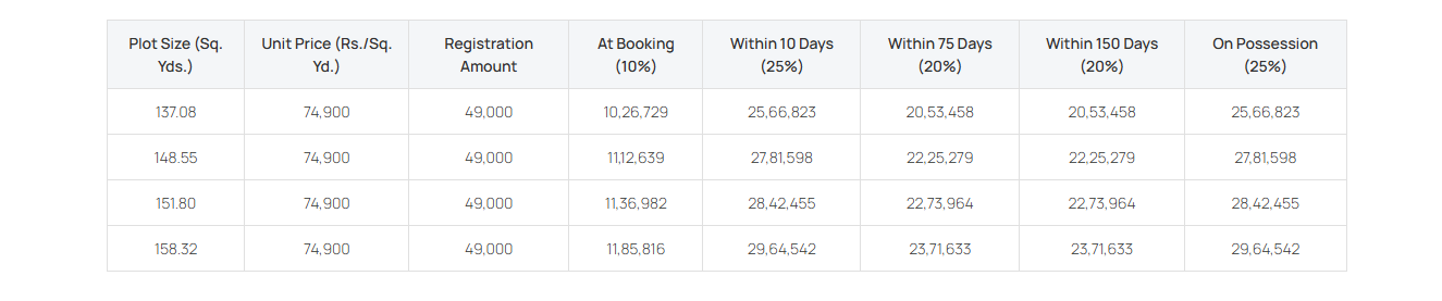 | Plot Size (Sq. Yds.) | Unit Price (Rs./Sq. Yd.) | Registration Amount | At Booking (10%) | Within 10 Days (25%) | Within 75 Days (20%) | Within 150 Days (20%) | On Possession (25%) |
